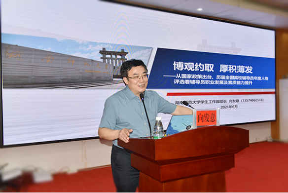 向发意讲座主题为“‘博观约取 厚积薄发’——从国家政策、历届辅导员年度人物看辅导员职业发展及素质能力提升”,包括从国家政策出台看辅导员职业发展前景、从辅导员年度人物评选看辅导员发展情与怀、辅导员素质能力提升路径之我见三个模块。他指出,辅导员队伍专业化、职业化是应势之举、应时之举、应需之举。他强调,辅导员惟有政治素养硬,才能精准锚定“为谁培养人”的方向;惟有育人目标明,才能亮剑回答“培养什么人”的问题;惟有业务能力强,才能切实履行“如何培养人”的责任。他认为,辅导员需要回归经典阅读,提炼工作,做有思想的行动者。