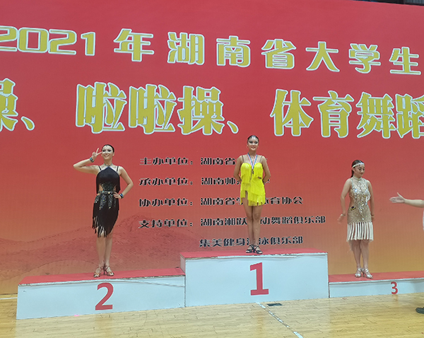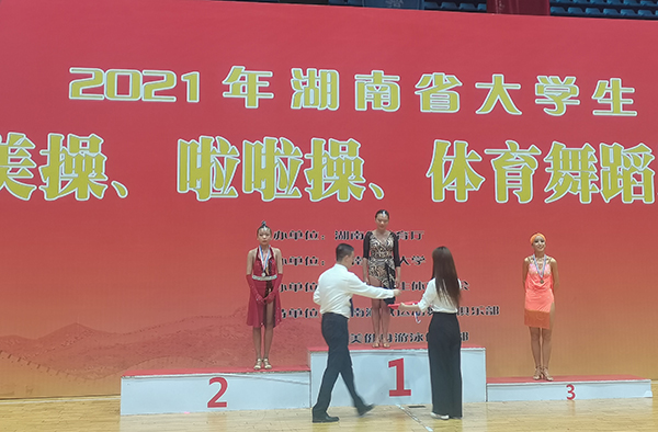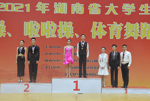 6月20-22日,由湖南省教育厅主办的2021年湖南省大学生体育舞蹈比赛在湖南师范大学举行,威尼斯官网在领队副校长游新娥、教练员何维峰、李荔、黄敏雄等老师带领下,经过赛前刻苦训练、积极备战,取得了优异成绩:胡婷同学获高职高专组女子单人牛仔项目第一名,王佳琳同学获女子单人斗牛项目第一名,朱振东、刘茗芊同学获高职高专组健身交谊舞伦巴双人项目第一名,朱振东、刘茗芊同学获高职高专组健身交谊舞快四双人项目第一名;罗卉南同学获高职高专组女子单人桑巴项目第二名,郑雪同学获高职高专组女子单人斗牛项目第二名;胡婷同学获高职高专组女子桑巴项目第三名。共获得4金2银1铜。这是学校领导大力支持和高度重视的结果,也是威尼斯官网实施“三全育人”的丰硕结晶。(李荔)