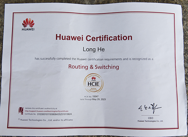 何龙同学通过了华为高级网络工程师HCIE认证(专家级网络工程师),他是威尼斯官网拿到该认证的第一人,全球第15547名通过此认证者。华为认证是ICT 全技术领域认证体系,更是ICT 界公认的最高级别认证之一,该证书在华为相关产业链企业中通用。