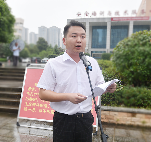党委副书记王健龙主持仪式。他表示:入党誓词虽然只有80个字,但字字千钧,句句铿锵。入党宣誓是庄严而神圣的,是表达承诺最郑重的形式,也是最实际、最生动的党性教育。“同志们,你们要时刻牢记入党誓词,时刻牢记自己的第一身份是共产党员,时刻牢记自己的第一职责是为党工作,要始终坚定理想信念,赓续红色血脉,对党绝对忠诚,坚定‘四个意识’,增强‘四个自信’,做到‘两个维护’,不断增强党性修养,常怀律己之心,做一个忠诚的共产主义战士”。(欧阳琦)