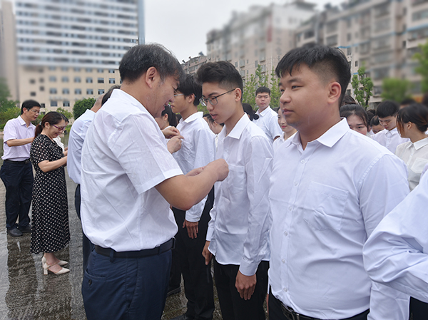 全体着装统一,整齐肃立,在雄浑的《国际歌》声中,仪式正式开始。党委书记朱忠义等老党员庄重地为新党员佩戴上党员徽章,并向新党员表示祝贺。