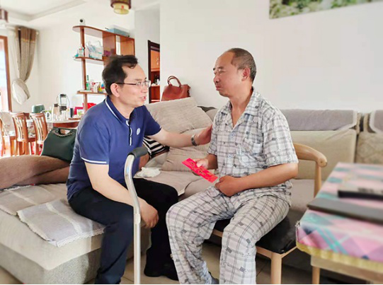 校长张征澜在困难党员龙中平家中了解到他因中风导致行动不便、家庭困难,鼓励他一定要调整好心态,并用实例激励他积极乐观面对生活。