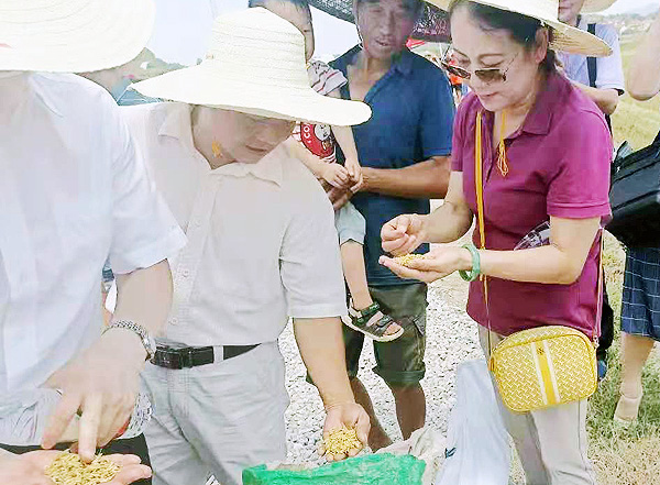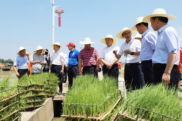 湖南省农业农村厅科教处处长蔡小汉(前排右一)到杨家滩水稻基地现场指导工作
