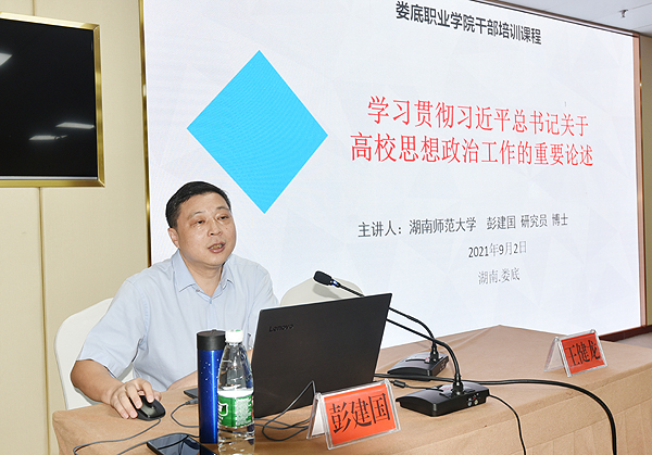 9月2日下午,湖南师范大学研究员彭建国博士作《学习贯彻习近平总书记关于高校思想政治工作的重要论述》讲座,就习近平总书记关于高校思想政治工作重要论述的发展历程、丰富内容、理论创新、主要特征、贯彻落实作了讲解。