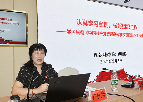 9月3日上午,湖南科技学院原党委组织部部长、党校常务副校长卢桂珍系统解读了新修订的《中国共产党普通高等学校基层组织工作条例》,并结合实例就如何学习贯彻落实好《条例》作了具体说明。