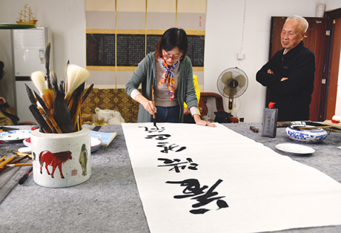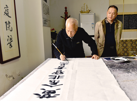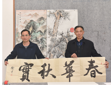张征澜观摩现场创作后,对欣赏的书法作品进行展示。