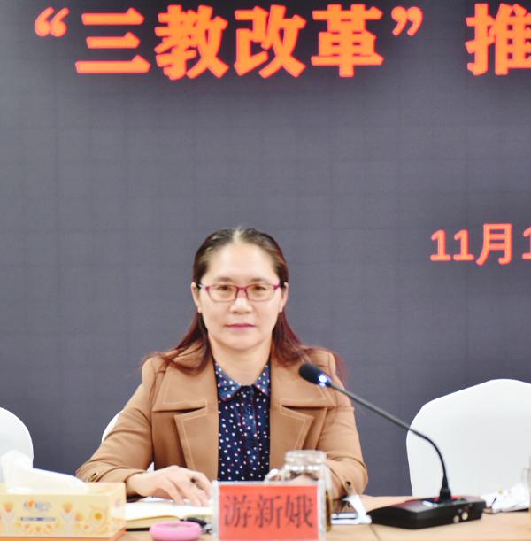 游新娥指出,要按照党委书记朱忠义的指示出台相关制度,并把“三教改革”的方案尽快落实,希望二级学院认真思考,结合专业特色做出具体的创新。
