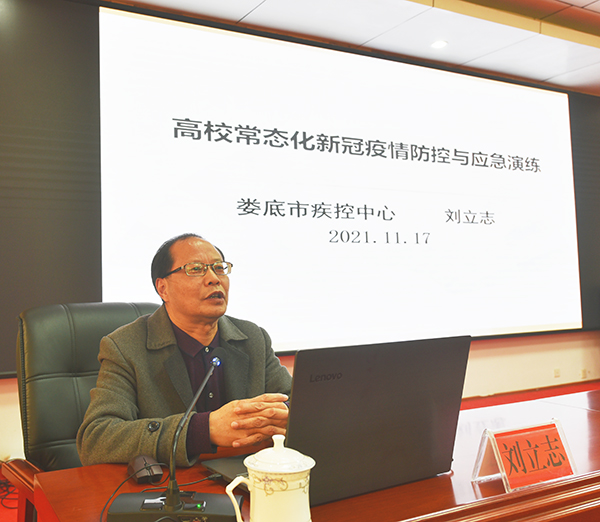 会议分为疫情防控专题培训、应急演练部署工作两个阶段。特邀娄底市疾控中心学校卫生科刘立志主任做专题培训讲座。
