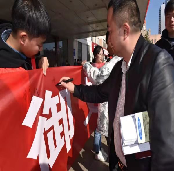 老师和同学们在“抵御艾滋,人人有责”的宣传横幅上签名。