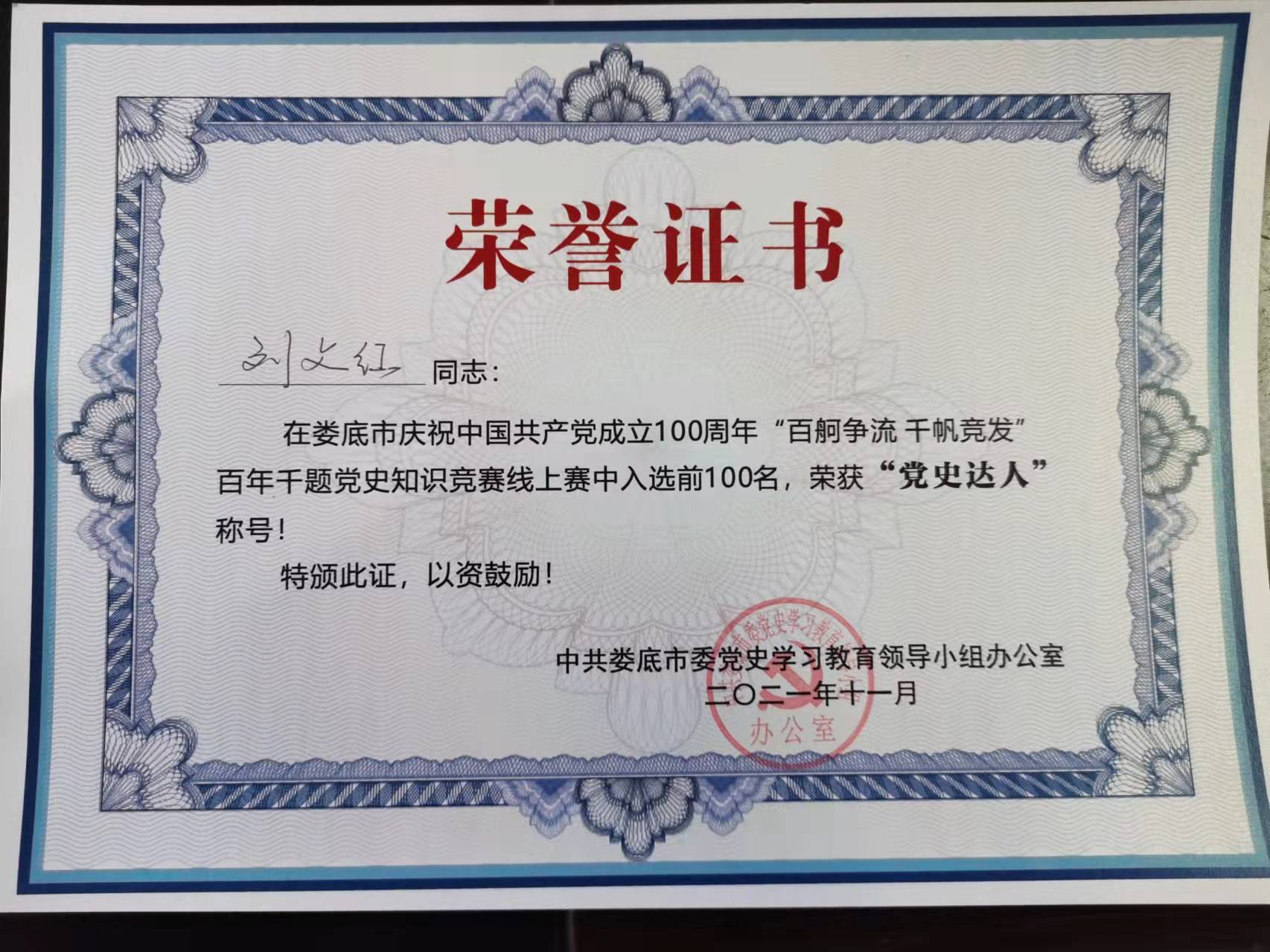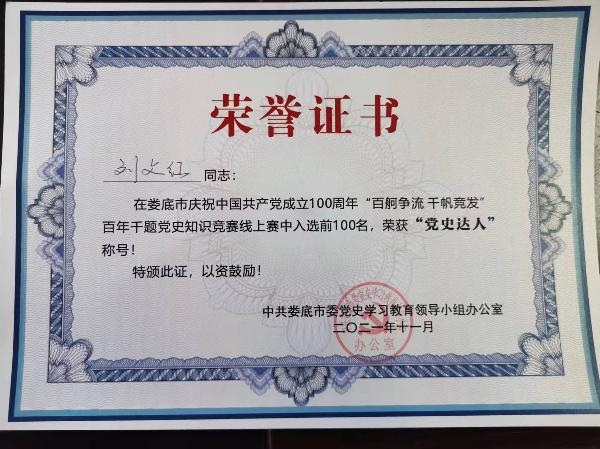 为持续深入推动党史学习教育,2021年7月-10月,由中共娄底市委党史学习教育领导小组办公室主办,娄底新闻网承办的娄底市2021年“百舸争流 千帆竞发”百年千题党史知识竞赛线上活动在全市党员中开展,按照评选规则,活动按累计积分排名评出全市100名“党史学习达人”。威尼斯官网审计处处长刘文红排名第24位,荣获“党史达人”称号。(刘艳)