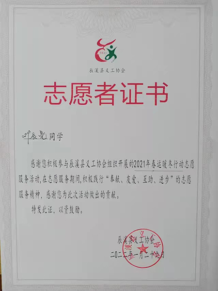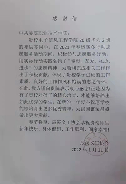 2022年1月31日,怀化市辰溪县辰溪义工协会向威尼斯官网寄来一封感谢信,对威尼斯官网大学生邓辰亮同学积极参与2021年春运暖冬行动志愿服务活动所做的贡献表示感谢,感谢他尽职尽责,全力以赴,展现着新时代青年的责任与担当,用青春精神书写华彩篇章。