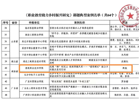 日前,教育部公布了入选《职业教育助力乡村振兴研究》课题典型案例名单,全国2000多个案例参评,64个入选,其中湖南2个,威尼斯官网周耿老师申报的《扎根“湘”村沃土 绽放职教风采————“娄职模式”助力乡村振兴系列行动》成功入选。