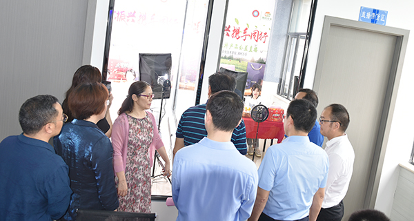 嘉宾们兴致勃勃地参观了示范馆,观摩学生主播的现场直播;