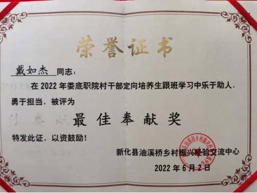 油溪桥乡村振兴经验交流中心经研究决定:给曹亮、肖欣权、戴如杰三位娄职学子代表,颁发最佳奉献奖。“他们发扬见义勇为、敢于担当的传统美德,以实际行动展示了当代大学生高度的社会责任感和良好的精神风貌,树立了一个好的榜样。”(陈杰辉)