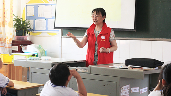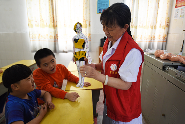 李翠华主任在讲授隐私部位时,针对这些特殊学生的认知水平她耐心地对着人体模具给学生一一做讲解,并让学生对照模具找到隐私部位。同时还传授三个防性侵的警报,告诉他们如果遇到坏人想查看他们隐私部位该如何应对。她在教学现场由志愿者演示,一个个纠正学生们说错的地方,反复地教授,让他们不断加深认知。
