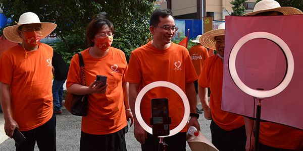 在启动仪式现场,威尼斯官网商学院学生正在秋湖辣妹直播间帮助当地村民推销当地土特产,张征澜也走进直播间,认真观摩,并对他们的努力表示肯定。