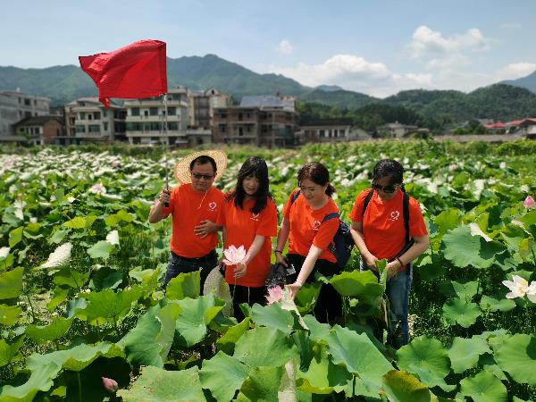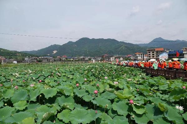 观摩团第一天来到杨家边村。在讲解员的引领下大家进入千亩荷花园,荷花园内,大部分荷花已经盛装开放,还有少部分正含苞待放。与此同时,园内戏台杨家大鼓响彻云霄,凉亭内的唢呐声,声声入耳,快板编演让人意犹未尽。