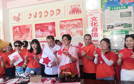 随后,观摩团来到了锁石镇的芙蓉村。在芙蓉村村部观摩农工党双峰县委党员创作基地,农工党党员王开健领衔创建的“不忘初心 牢记使命”剪纸主题教育展馆,观摩团成员现场体验了剪纸艺术。