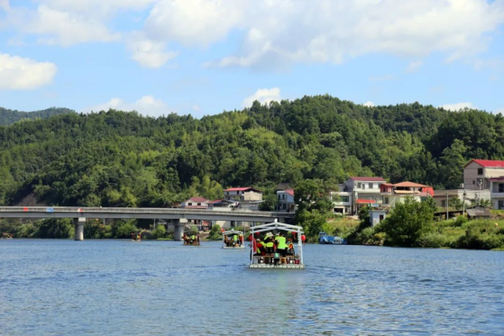 当天上午,观摩团成员乘坐竹筏,逆河而上,欣赏沿途美景。