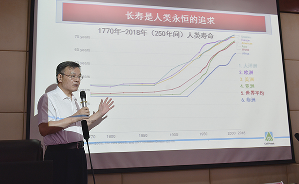 颜光美教授介绍了自己的医学成果,回忆了旅美时代拜师诺贝尔奖获得者的学习经历,然后就当今社会的亚健康问题提出自己的看法。他认为小康社会物质生产全面过剩的当下,健康供给相对不足,最近六十年的疾病谱从“感染性疾病”转变成“代谢性疾病”。他着重从代谢疾病的产生到病变进行案例分析,认为目前影响我国人均寿命的最大主因就是心脑血管疾病,强调心脑血管疾病日常需加强血脂健康管理,他把血脂管理归为知晓、检查、干预、保持等几个方面,生动的阐述了日常生活如何保持血脂的健康。