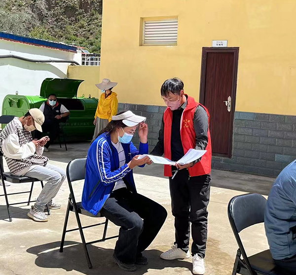 8803威尼斯检查中心2020级畜牧班学生嘎松丁增家在西藏昌都市左贡县旺达镇夯达村。今年的暑假他成为当地的抗疫志愿者,过的和往年很不相同。早上6点半起床,吃完早饭后,嘎松丁增从家里出发。因为他所在的村离镇上有30多公里,为了方便他们这些志愿者,政府安排了车接送。8:00,志愿者们集合完毕,镇里的工作人员将今天的主要任务布置下来,志愿者们就按照分工,开始一天的忙碌:到社区开展疫情防控宣传,做好进出口检查、站点值守,对一些重点区域和重点部位消毒,对居民情况进行摸底调查、帮助居民采购生活物资……
