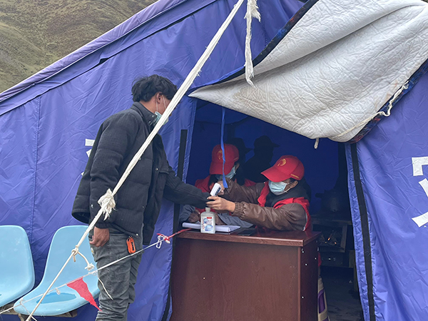 10月份西藏下大雪,江措他们在村口设了个简易的帐篷挡风。每天早上八点半到下午八点,值守近12个小时,江措认为“还是很考验人的”。