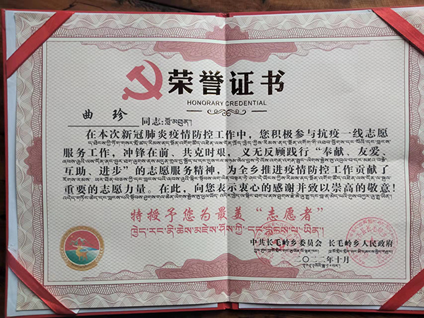 因为志愿行动表现优秀,当地政府给江措颁发了荣誉证书。