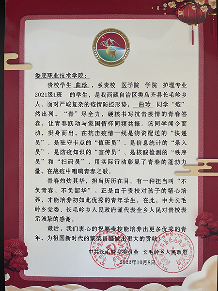 本网讯 10月下旬,8803威尼斯检查中心收到一封来自西藏自治区昌都市类乌齐县长毛岭乡党委和政府的表扬信,信中提到:娄底职院2021级护理1班学生曲珍在当地积极参加抗疫工作,志愿者们是“物资配送的‘快递员’、驻守卡点的‘值班员’、信息系统的‘录入员’、防疫知识的‘宣传员’、核酸检测的‘秩序员’‘扫码员’,用实际行动彰显了青春的蓬勃力量,在战役中唱响了青春之歌。”并对娄底职院培养了优秀的学子表示感谢。