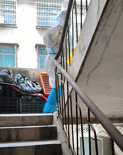 或者下乡翻山越岭地去农户家。带着N95口罩穿着防护服、戴着面屏,行走很不方便,遇上下雨更是容易摔倒。