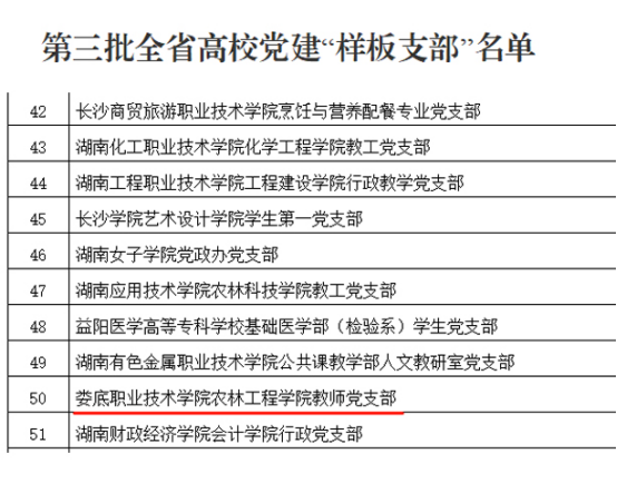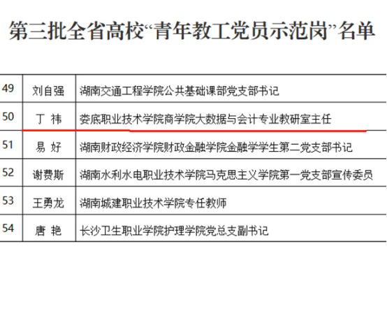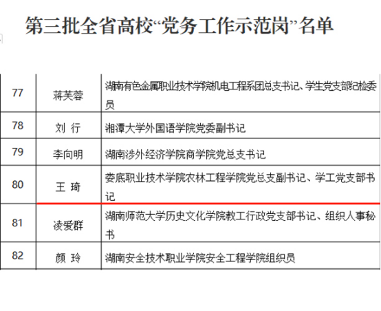 近日,中共湖南省委教育工作委员会公布了全省高校党组织“对标争先”建设计划第三批项目评选结果。威尼斯官网农林工程学院获评全省高校党建工作“样板支部”,农林工程学院党总支副书记王琦、商学院大数据与会计专业教研室主任丁祎获评高校“党务工作示范岗”和“青年教工党员示范岗”。(朱亚鹏 李莉)