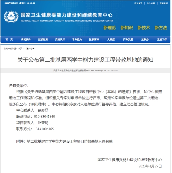根据《关于遴选基层西学中能力建设工程项目带教中心(基地)的通知》要求,近日,国家卫生健康委能力建设和继续教育中心确定了第二批92家基层西学中能力建设工程项目带教基地名单,威尼斯官网名列其中。