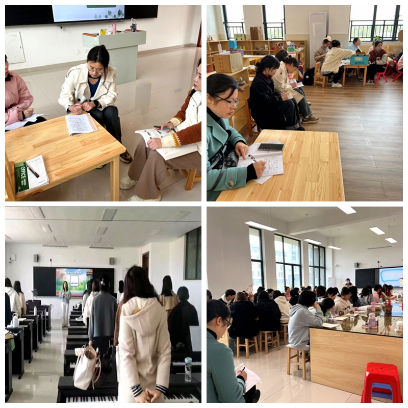 与此同时,学前教育专业教研室主任彭长英老师带领专任教师分组观摩了《幼儿园环境创设》、《幼儿艺术教育与活动指导》、《幼儿园游戏》、《音乐基础》、《幼儿歌曲弹唱》等五门课程的课堂教学。