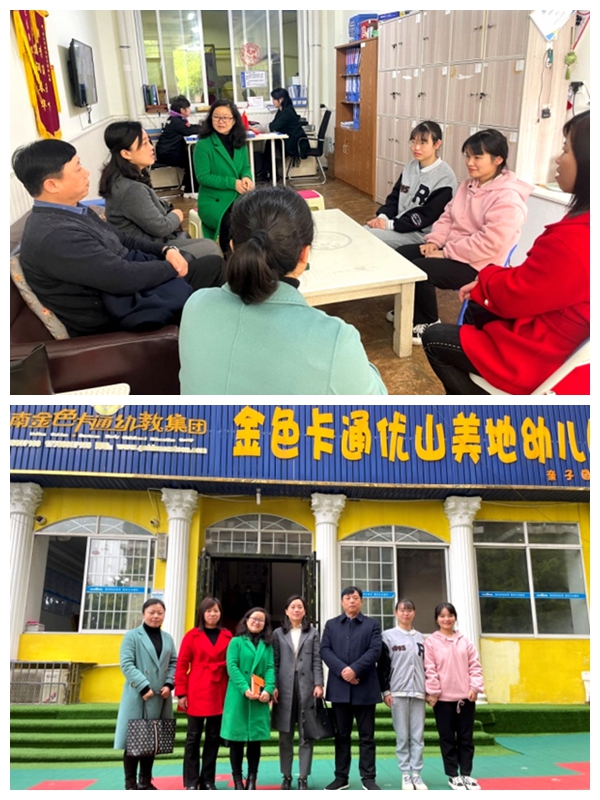 下午,一行10人赴金色卡通优山美地幼儿园进行调研,看望慰问实习生,并与园长深入交流,园方表扬实习学生吃苦耐劳、谦虚好学,深得家长喜欢,希望学生毕业后能继续留下来工作。