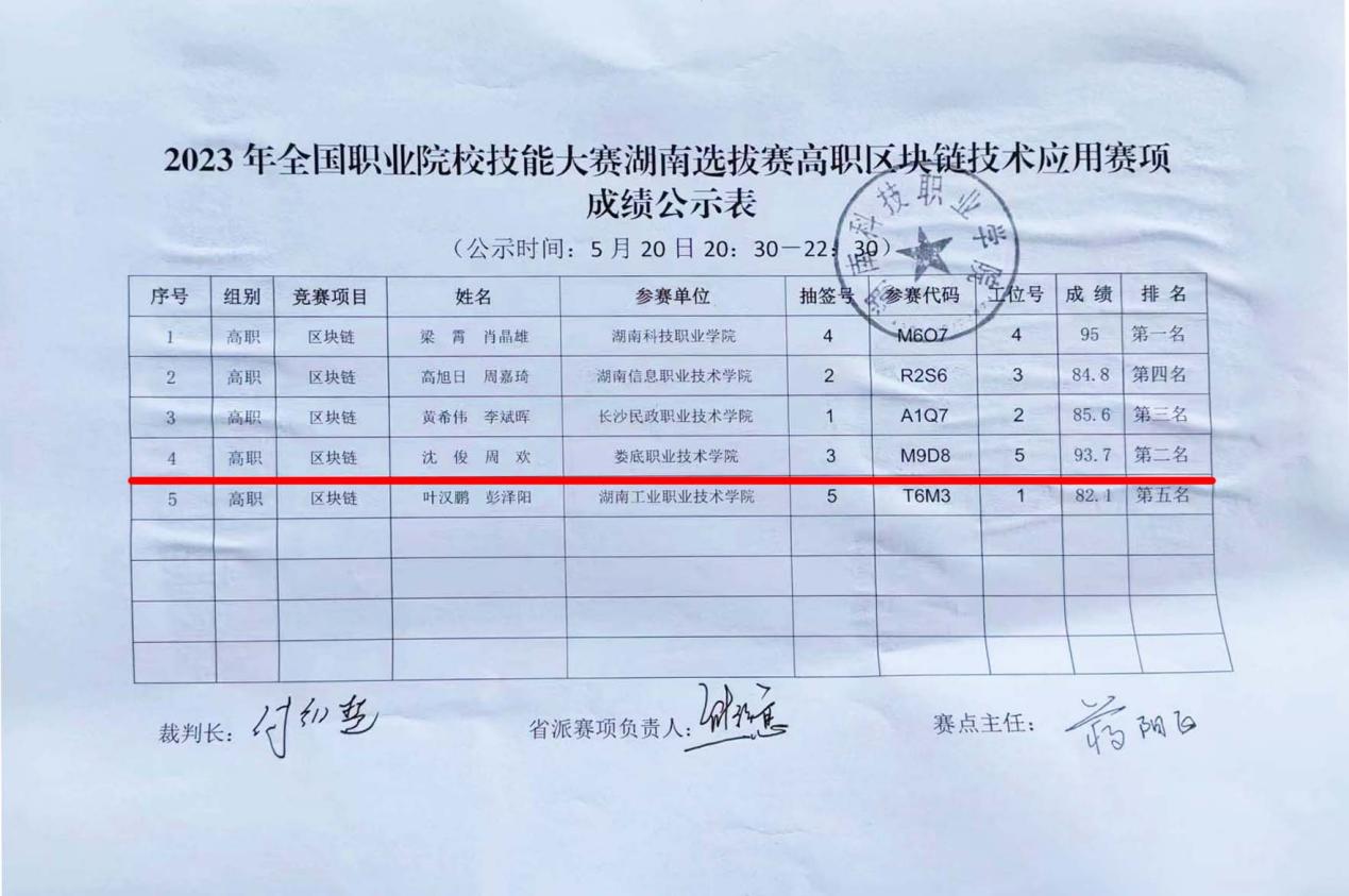 5月20日,2023湖南省职业院校技能竞赛国赛选拔赛在湖南科技职业技术学院圆满举行,来自区块链领域的知名专家学者、企业领袖、行业翘楚齐聚星城长沙,威尼斯官网电子信息工程学院代表队在竞赛中发挥出优良技术水平,获得湖南省第二名的好成绩,成功晋级区块链赛项国赛。