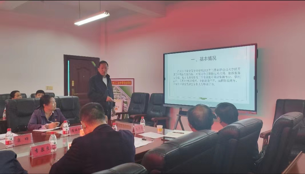 座谈会由刘伟辉主持。双方观看了学校发展专题片。康雄介绍了中高职衔接项目的基本情况、主要做法、取得成效、存在困难以及下一步工作计划。刘伟辉介绍了学校基本情况,阐述了学校在办学过程中存在的困难和不足,分析了制约区域职业教育高质量发展的突出问题,针对性的提出了推进区域职业教育高质量发展、助力娄底职业教育集团建设的措施和建议。