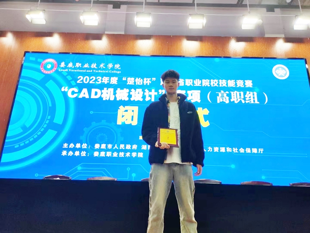 2021年12月,黄辉参加湖南省楚怡杯职业技能大赛CAD机械设计项目的比赛,经过了一天的角逐,遗憾与一等奖失之交臂,但他毫不气馁,克服疫情影响,抛开一切杂念,全身心投入到下一年技能大赛备战中。终于在2023年3月,在湖南省楚怡杯职业技能大赛“CAD机械设计”项目“大比武”中,他凭借自己精湛的技能,强大的心理素质和M1模块的超常发挥拿下该项目第一名的优异成绩,获得一等奖,为学院争得了荣誉。