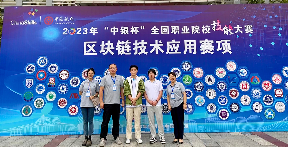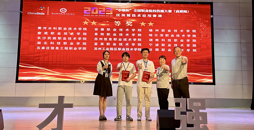 10月20日,2023年“中银杯”全国职业院校技能大赛区块链技术应用赛项在河北软件职业技术学院圆满落幕。77支来自全国各地职业院校的优秀代表队参加了此次比赛。威尼斯官网周欢、沈俊两位参赛选手在指导老师陈巍峰、谭宁的精心指导下,在激烈的竞争中脱颖而出,荣获全国第十二名、国家二等奖。