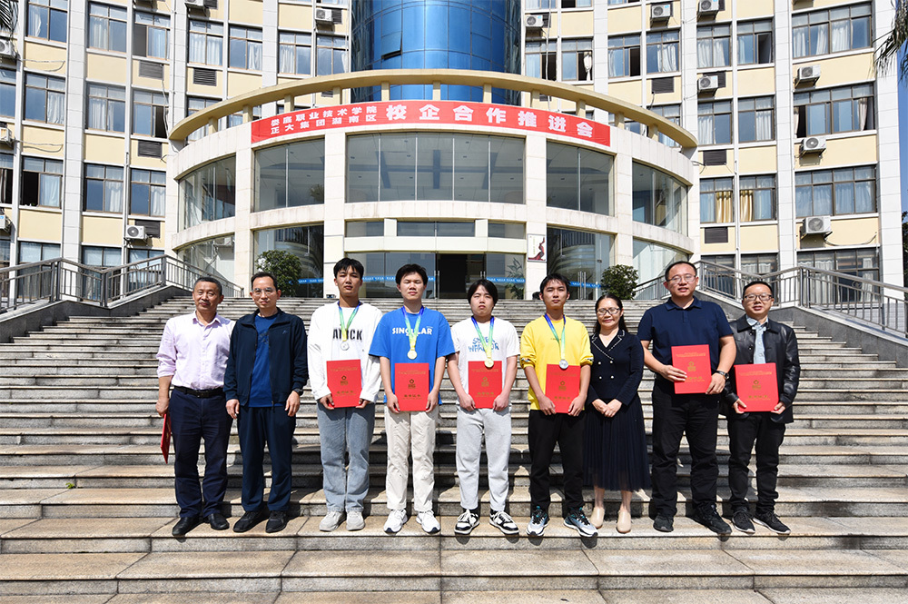 校长张征澜、副校长游新娥与获奖选手和指导老师合影