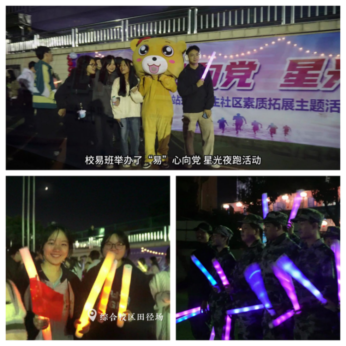 为丰富学生社区文化生活、加强学校“一站式”学生社区建设,鼓励广大大学生积极参与体育运动,增进同学之间的联系和友谊,焕发学生运动活力,学校组织开展“易”心向党星光夜跑活动,以引导广大在校大学生“走下网络、走出宿舍、走向操场”,多参与体育运动,锻炼身体,健康地学习生活。