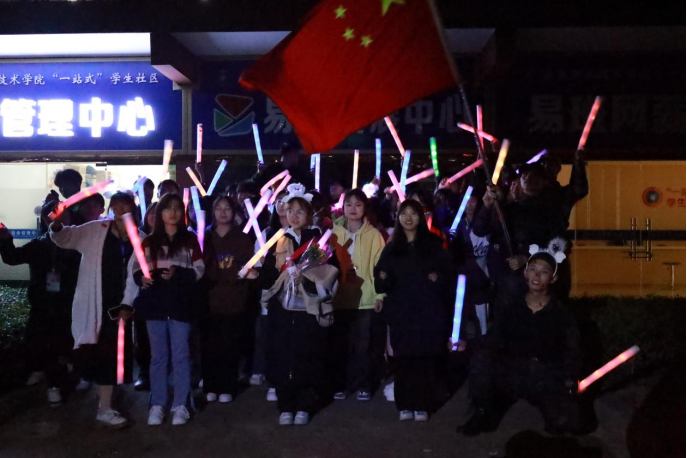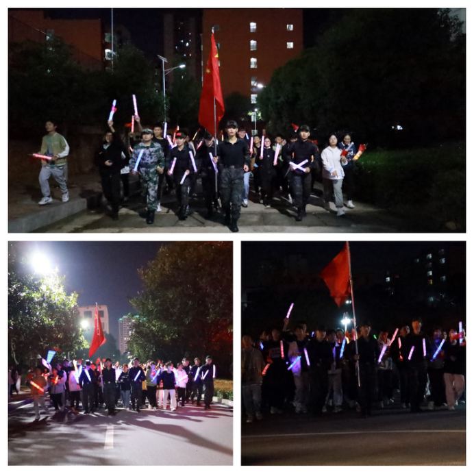 经过简单的热身后,同学们挥舞着手中的荧光棒从田径场出发,领队高举着五星红旗带跑,大家有条不紊地紧随其后,围绕学校“一站式”学生社区开展夜跑活动。在夜幕下,参与夜跑活动的同学们挥洒汗水,尽情奔跑,荧光棒闪烁成一片星光海洋。沿途观众也为参与活动者们加油助威,共同感受着运动的快乐和激情。