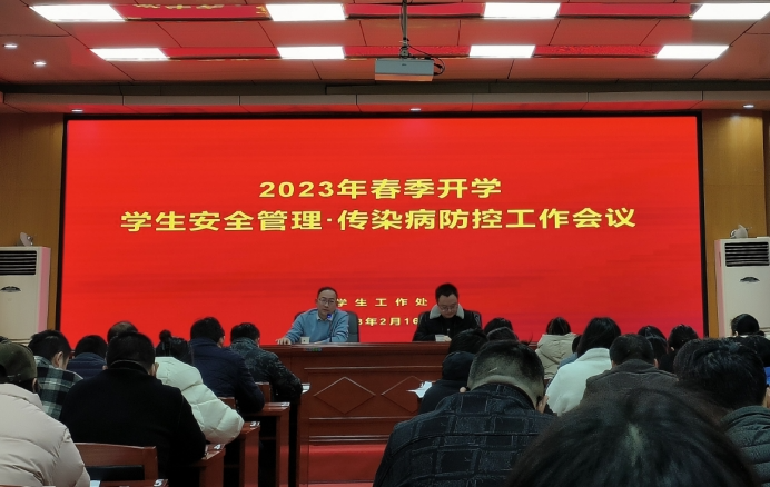 为进一步统筹谋划、安排落实好2023年春季学期的各项工作部署,确保新学期学生管理工作平稳有序运行,2023年2月17日上午,学校组织召开学生安全管理暨传染病防控工作会议,全体学生管理工作队伍参会,会议由学生工作处处长李规主持。