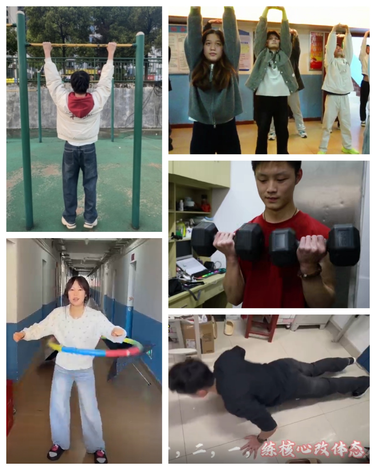 活动启动前,同学们主动开展体能自测,认真记录体重、基础体能等个人数据,以科学方式开启每日锻炼,做到心中有数、练有目标。运动现场,宿舍变身活力满满的迷你健身场,八段锦、呼啦圈、俯卧撑、力量训练、拉伸舒展等项目轮番上阵。大家或独自专注练习,或室友结伴比拼,在有限空间里释放无限能量,用坚持点亮青春健康底色。